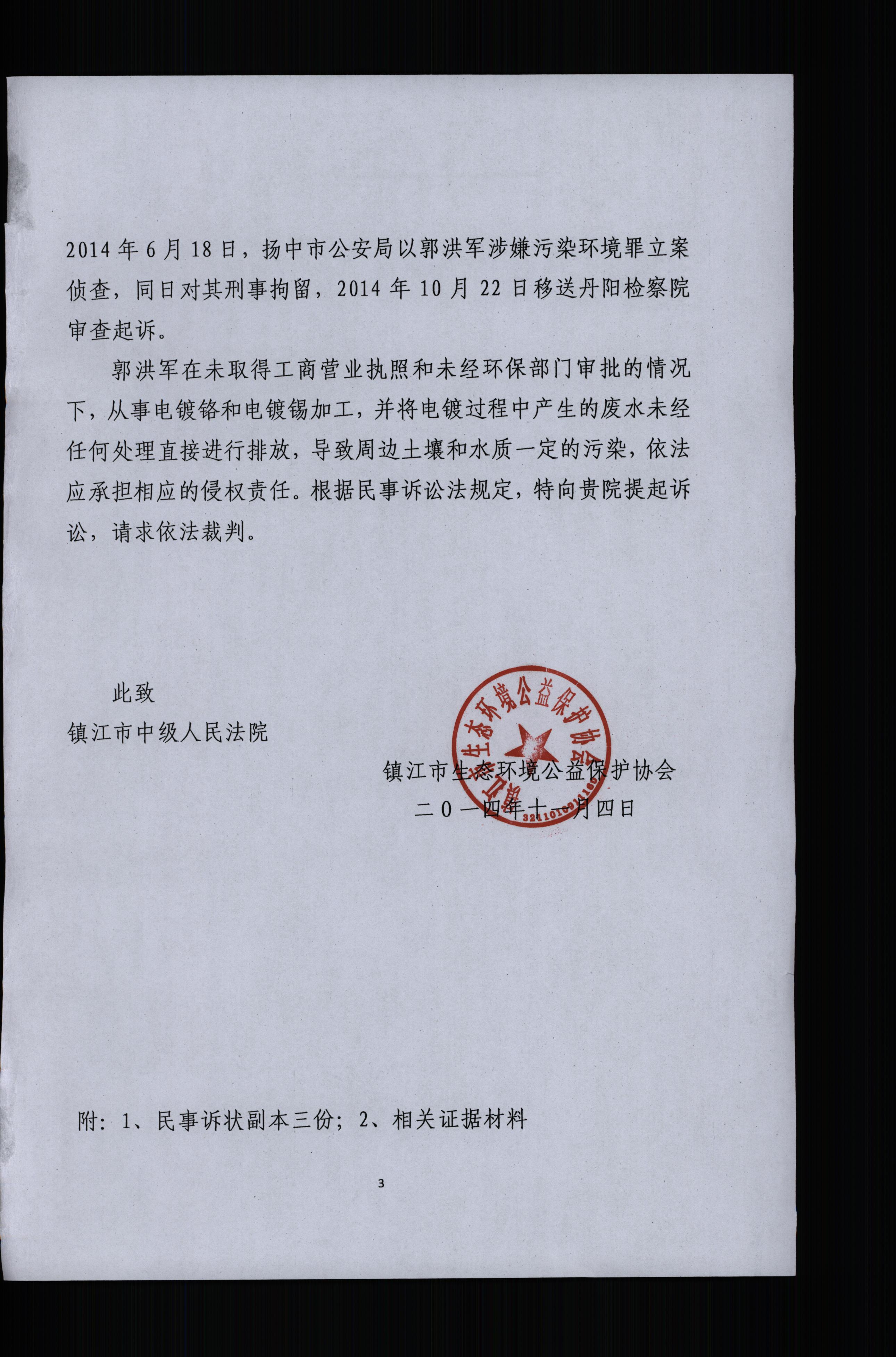 本院于2014年12月30日受理原告镇江市生态环境公益保护协会诉被告郭洪军环境污染责任纠纷民事公益诉讼案件(附:环境民事公益诉讼诉状)。依据《最高人民法院关于审理环境民事公益诉讼案件适用法律若干问题的解释》第十条之规定,现予公告。有权提起诉讼的其他机关和社会组织在本公告之日起三十日内可以申请参加诉讼,经本院审查符合法定条件的,将被列为共同原告;逾期申请的,不予准许。