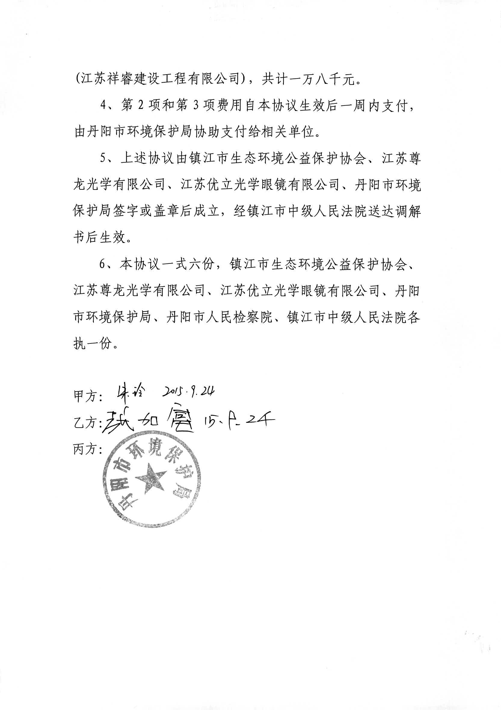 关于镇江市生态环境公益保护协会诉江苏尊龙光学有限公司、江苏优立光学眼镜有限公司环境污染责任纠纷民事公益诉讼案件调解协议的