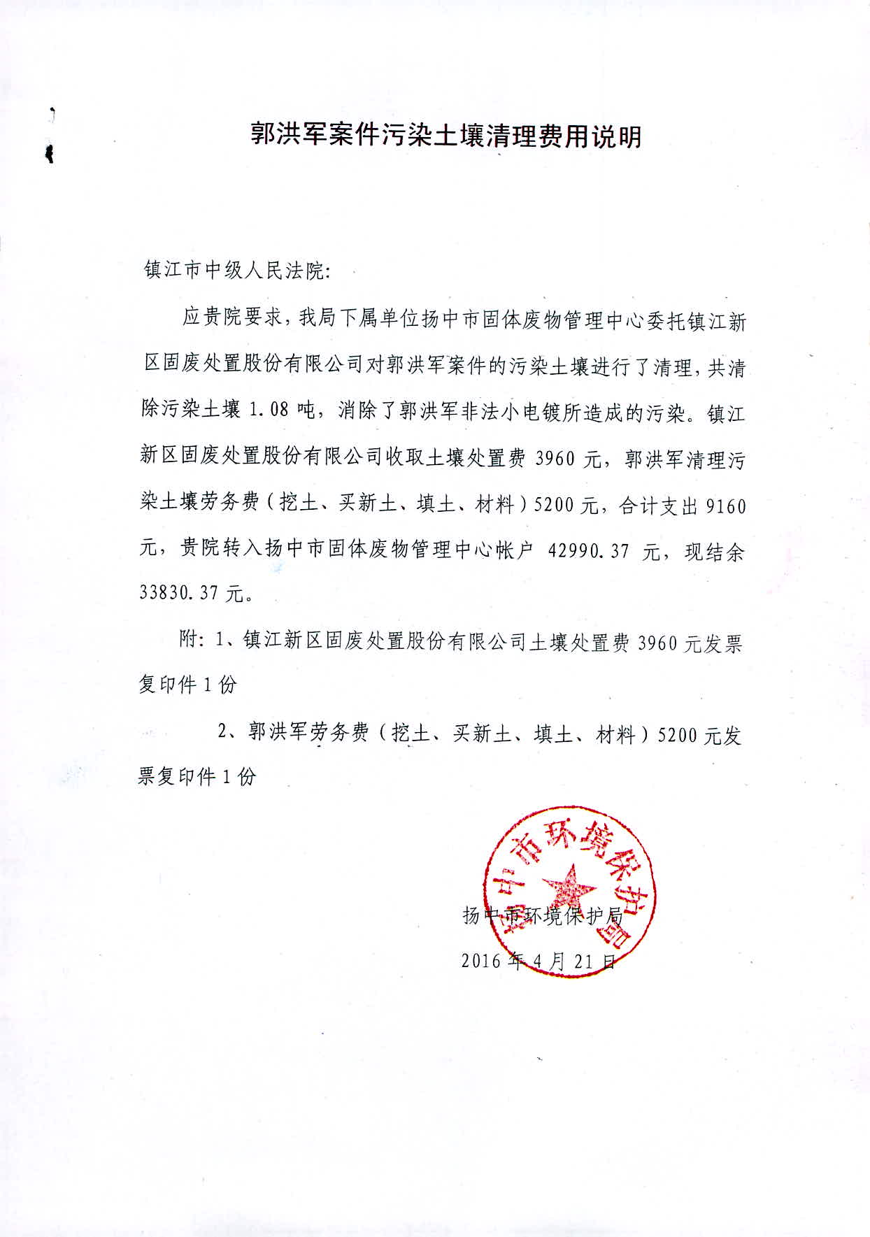 郭洪军案件污染土壤清理费用说明