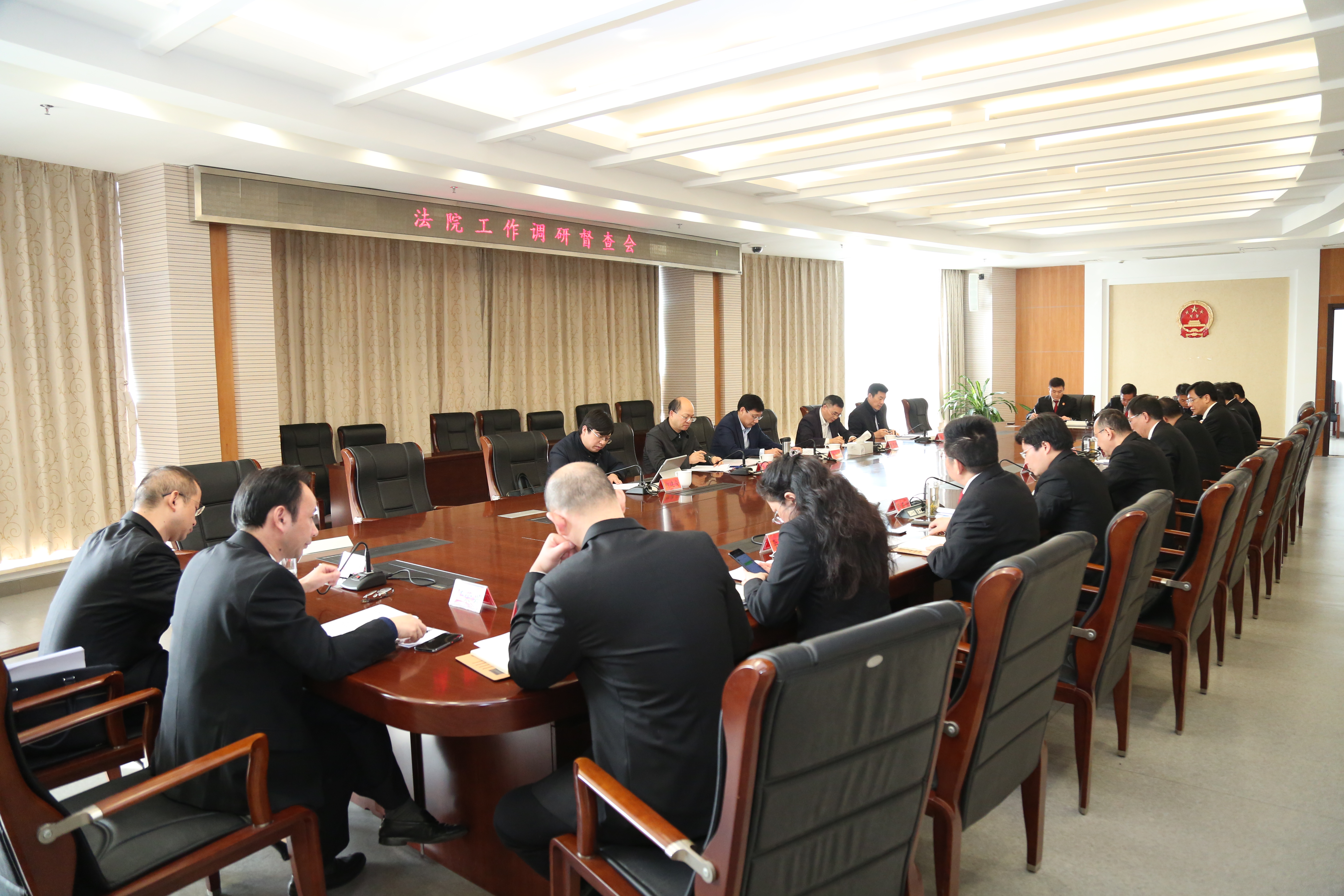 调研督查会上,开发区法院党组书记、院长卜士凡汇报了该院近年来审判执行工作基本情况,深入分析了现阶段工作中存在的问题和不足,明确了努力方向和应对举措。汤院长充分肯定了该院近年来保护创业创新、审理破产案件、基本解决执行难、矛盾纠纷多元化解、司法改革和信息化建设等方面取得的成绩,并就提升审判执行绩效、速裁团队管理、执行指挥中心实体化运行、加强小额动产处置、执行团队化建设、司法安全保障、辅助事务外包等相关工作提出了明确要求。