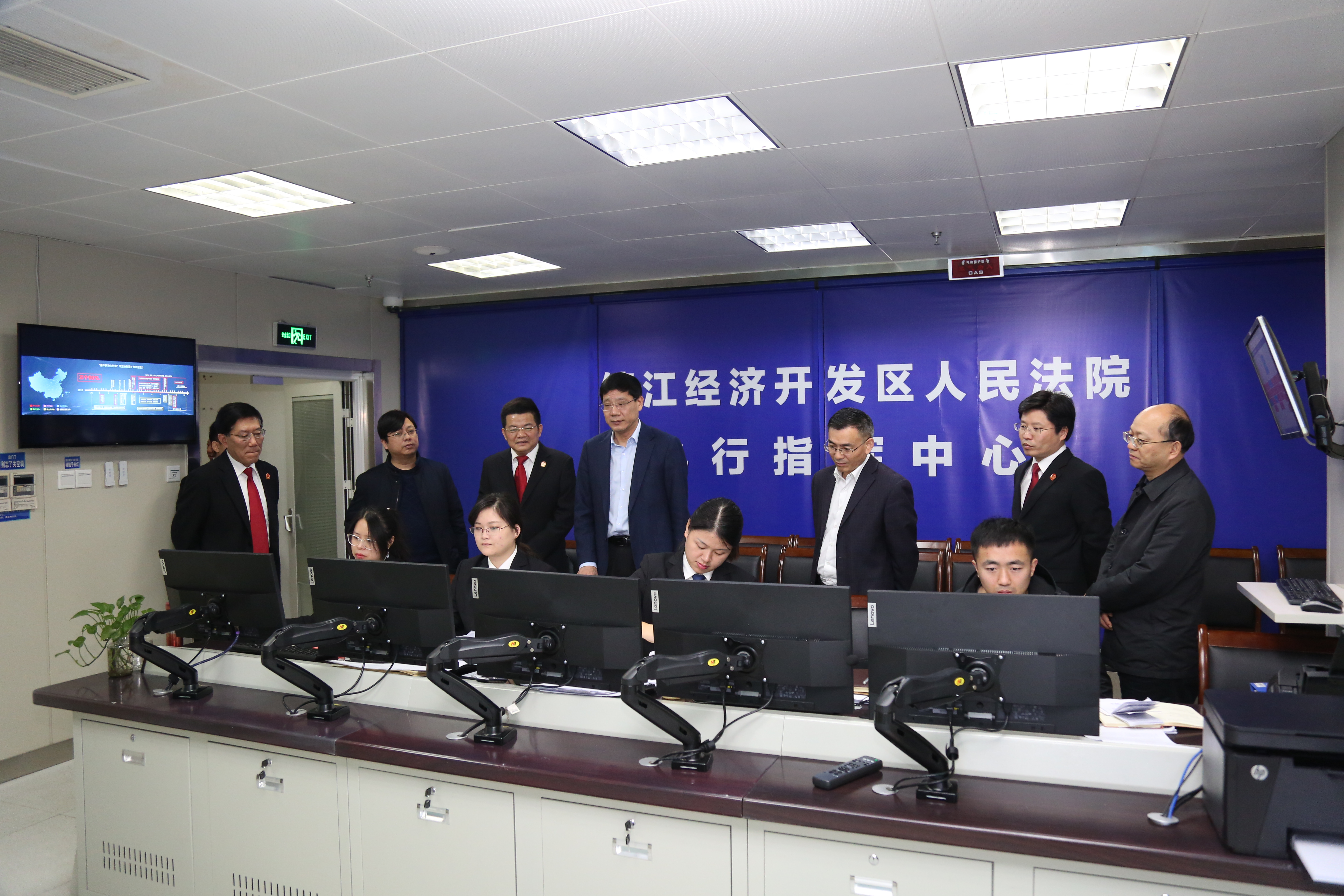 汤院长一行先后视察了开发区法院诉讼服务中心、执行指挥中心和审判法庭,了解“云上法庭”建设情况,并检查了刑事案件押解通道。