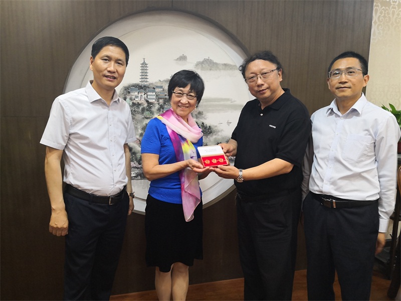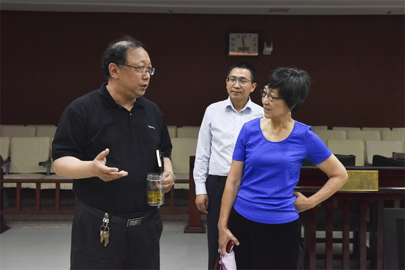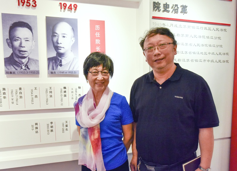 在中院党组成员、副院长吴猛、镇江市侨联党组书记、主席王永新的陪同下,陈杨国生参观了院史馆,看到了院长介绍版块中父亲的照片和法官墙上父亲的名字,她激动驻足。更巧的是,她的侄女郑清也担任过镇江中院副院长。吴院长还向陈杨国生赠送了小法徽纪念章。