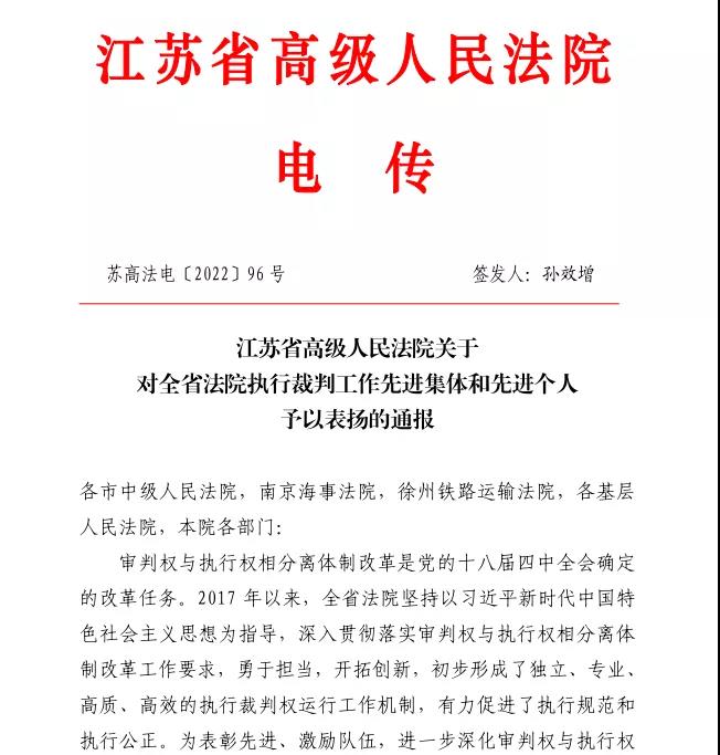近日,为进一步深化审判权与执行权相分离体制改革工作,江苏省高级人民法院对全省法院执行裁判工作先进集体和先进个人予以通报表扬。