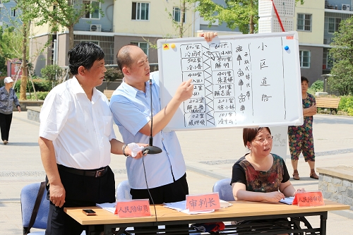 6月18日上午,在镇江新区平昌新城新茂苑广场上,几张简易的桌椅上摆着审判长、人民陪审员、书记员、原、被告及代理人的桌牌,三条红色条幅,组成了一个简单却充满人性化的巡回法庭。平昌新城社区干群百余人参加了旁听。