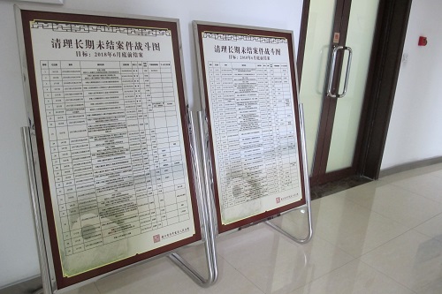 近日,在开发区法院执行局的办公区域最显眼处,放置了两张“战斗图”,上面详细标注了开发区法院12个月以上未结案件的案由、承办人、拟结时间等信息,共计有77个案件“榜上有名”。