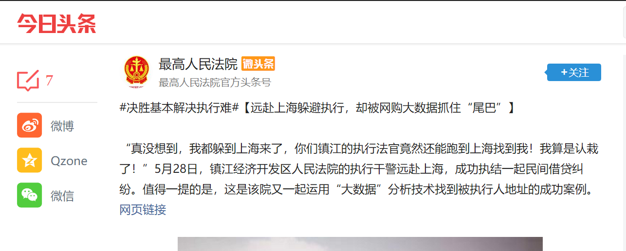 2017年6月起,与知名移动支付平台和电商平台建立对接机制。执行指挥中心定期推送被执行人身份信息。目前,各平台共查询和反馈210余名被执行人账户余额、收货地址等信息,成功拘传被执行人21人,执行到位标的额近30万元。2018年5月28日,被执行人倪某躲在上海,执行法官通过电商平台“大数据”分析,成功在上海找到被执行人,案件最终得以执结。该案例被最高人民法院和人民法院报微信全文转载。