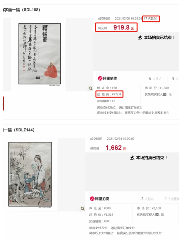 2021年一季度,经开区法院还举办了字画专场拍卖,200多幅字画作品吸引了众多书画爱好者竞相“下单”。其中一副书画,吸引了719次围观,6名竞拍者报名。经过20轮竞价、17次延迟,这件起拍价为772.8元的书画最终以919.8元成交,溢价率近20%。另有一幅以1662元成交的字画,则是这批书画拍品中成交额最高的一件。