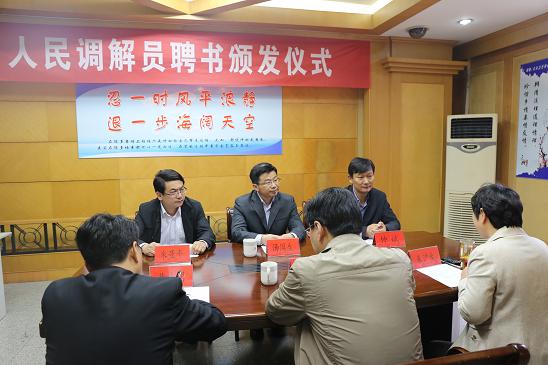 新任人民调解员朱沪生表示,将尽快适应角色转换,尽力做好人民调解工作。司法局仲斌局长对朱沪生同志加盟人民调解员队伍表示真诚欢迎,他期待诉调对接工作在今后一段时期有新的进展和特色,并表示会全力支持人民调解工作。